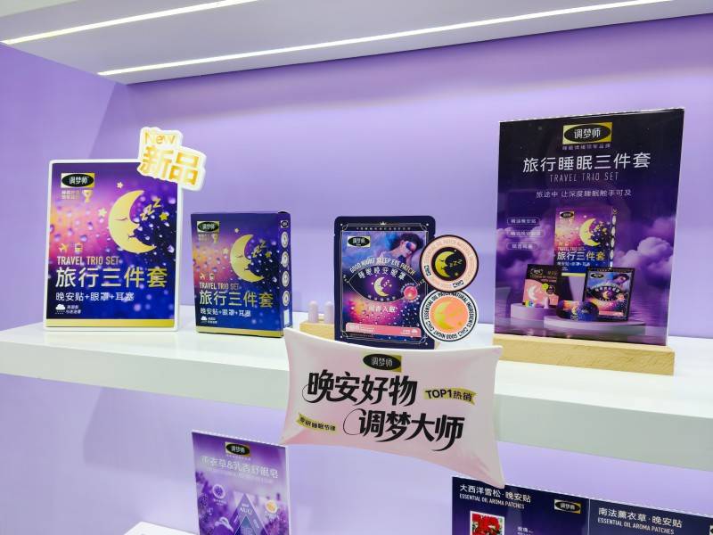 一旁的旅行睡眠三件套同样人气高涨。这套包含精油晚安贴、精油晚安眼罩与睡眠耳塞的组合,以品牌两款经典爆款为核心——精油晚安贴与眼罩是 “非药物助眠” 代表,前者全球销量超 3000 万贴。“差旅失眠多因环境陌生、光噪干扰,我们的套装正好对症下药。”品牌工作人员介绍,晚安贴采用缓释微囊技术,融合薰衣草、洋甘菊精油,香气可持续 8-10 小时,无需口服贴肤;眼罩延续草本内芯,搭配降噪耳塞,形成 “嗅觉 + 视觉 + 听觉” 三重疗愈。