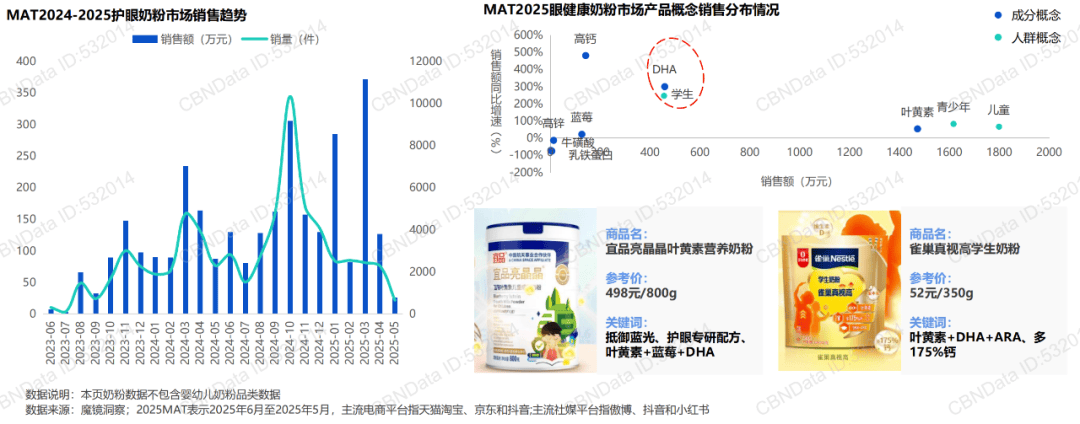 、学生概念增速较高,学生人群存在护眼+补脑的双重功效需求,部分产品也在护眼的基础上叠加补脑、增高补钙等功效卖点。护眼学生奶粉
